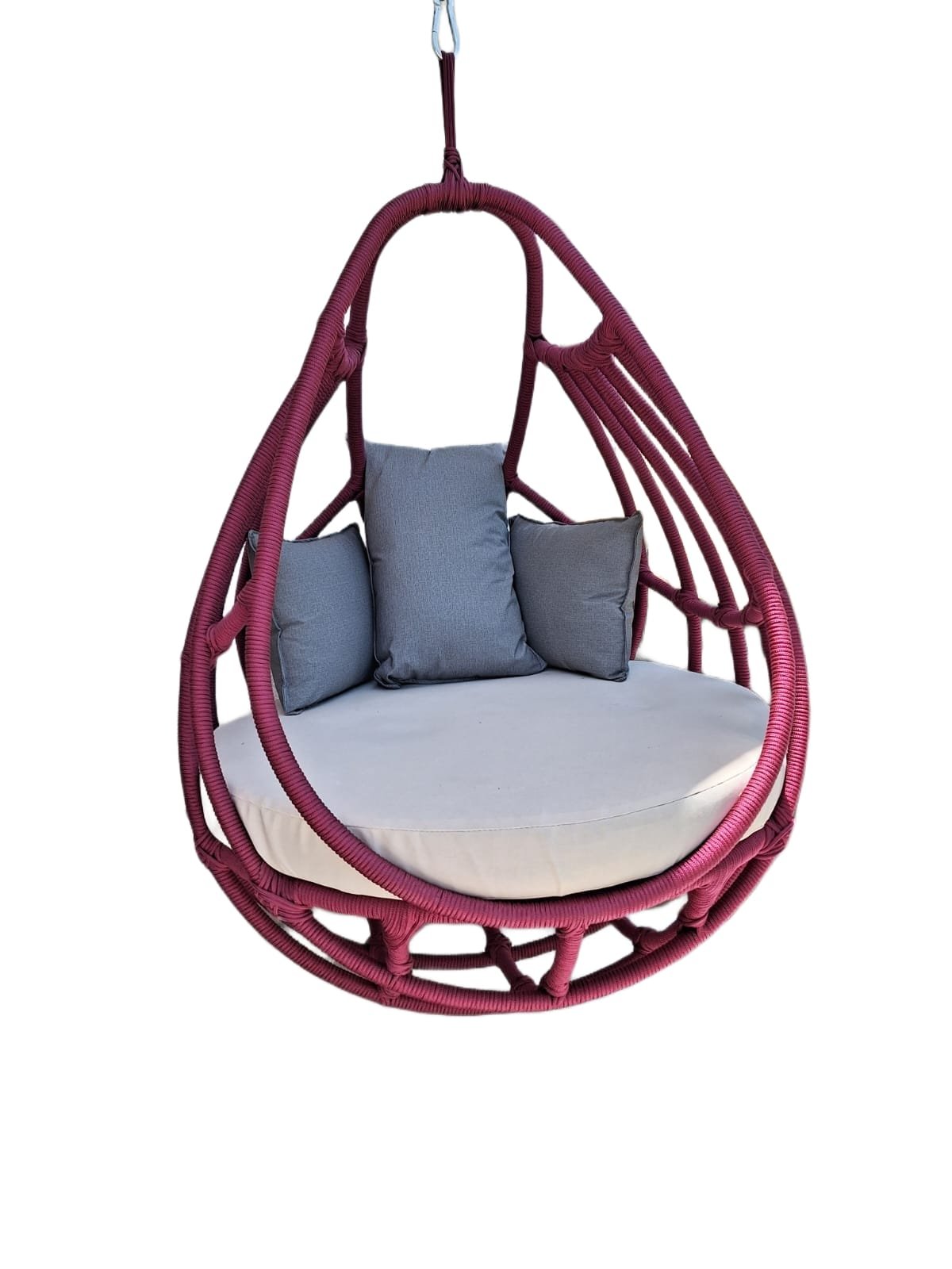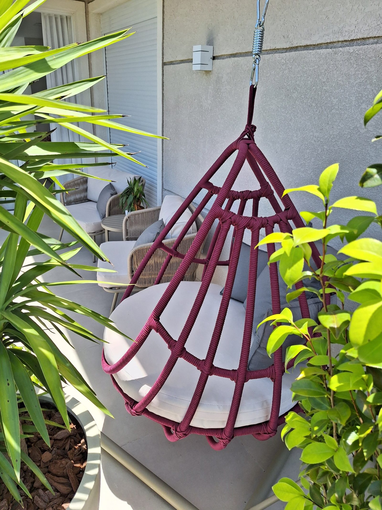 Estrutura cor vinho com colchão em tecido duna cru, almofadas soltas em tecido grafite e corda náutica redonda 6mm cor vinho
