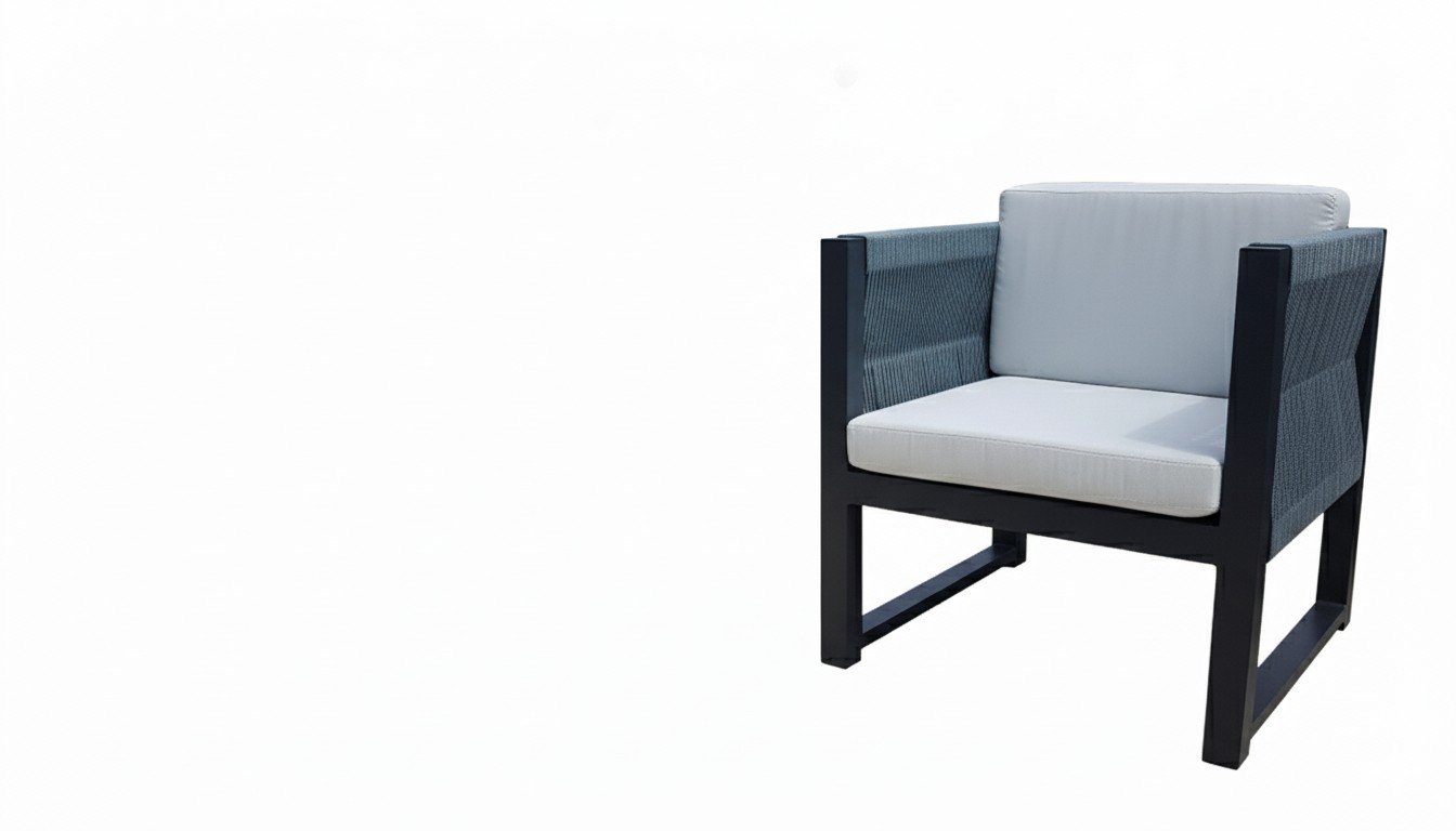 Estrutura cor preto, estofamento cinza claro e acabamento em corda náutica redonda 6mm cor cinza